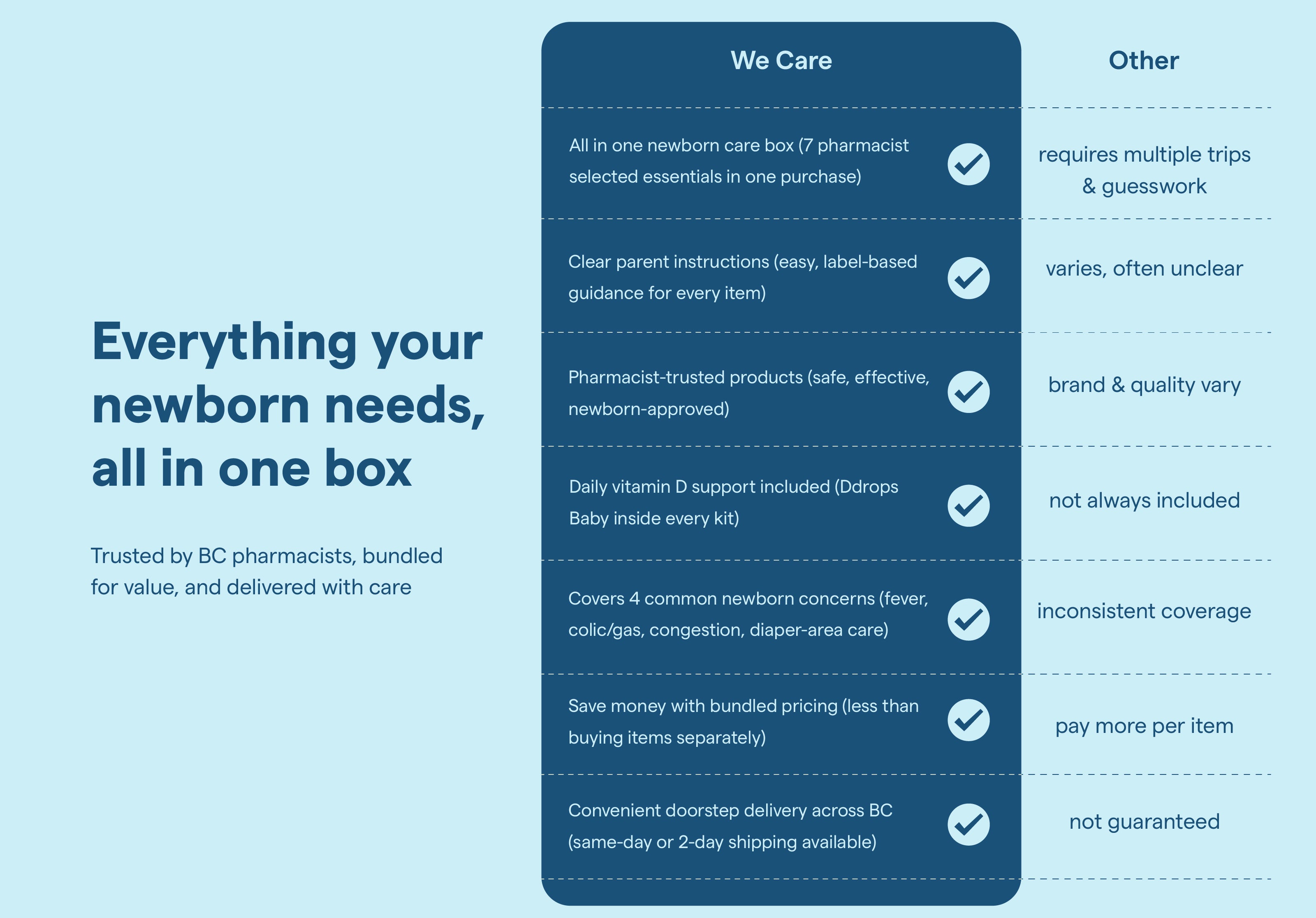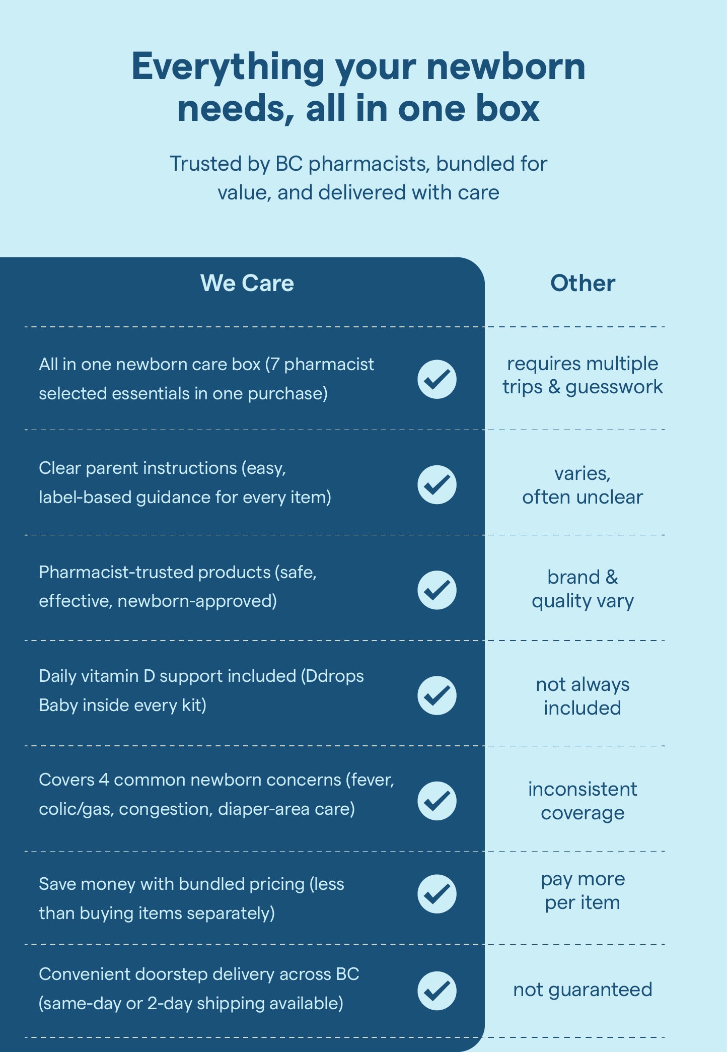 Give your newborn the best possible care with our pharmacist-approved Newborn Health Medicine Kit. This bundle includes all the essentials trusted by Canadian parents and healthcare professionals to help you manage fevers, colic, tummy troubles, and daily comfort at home.
