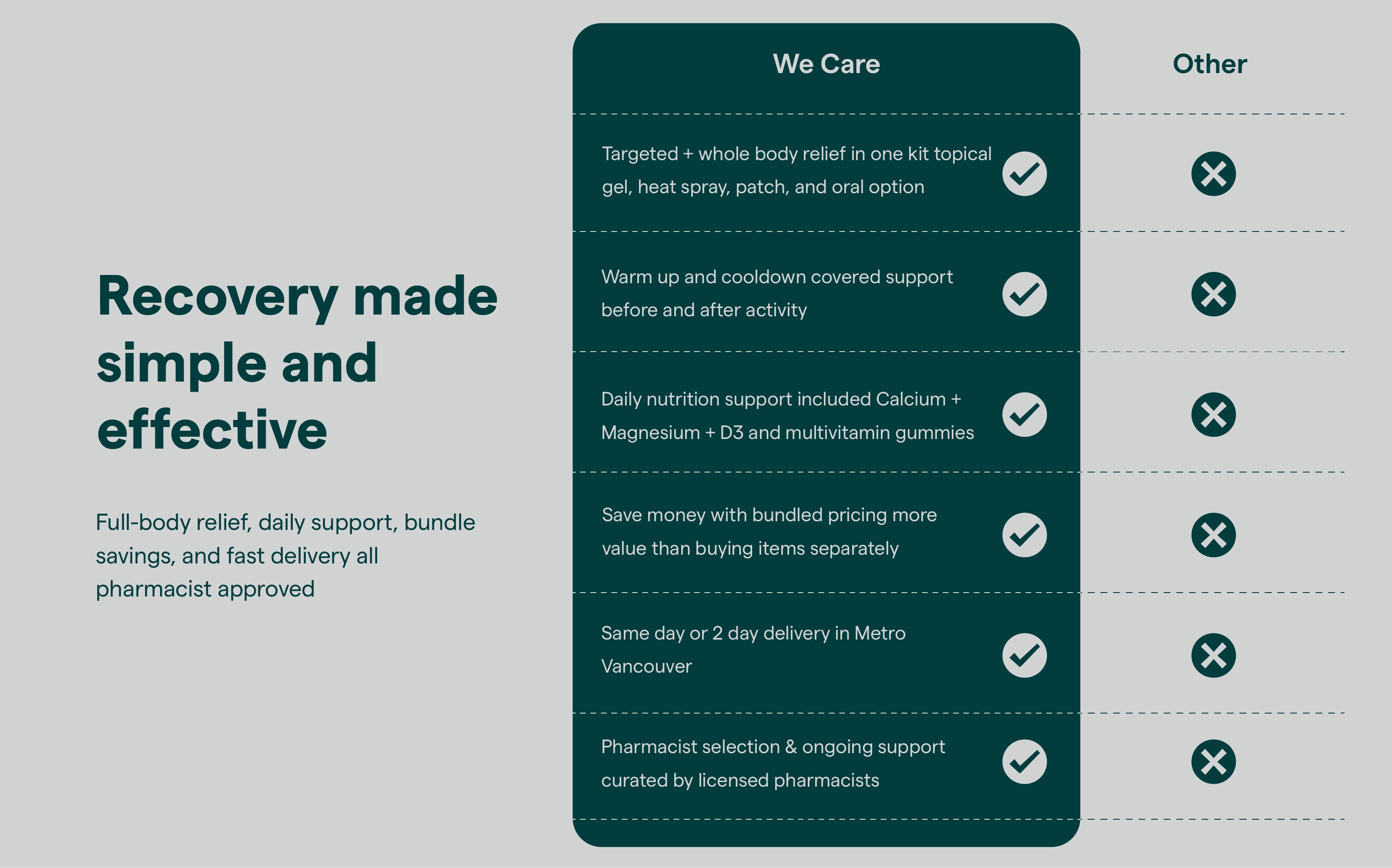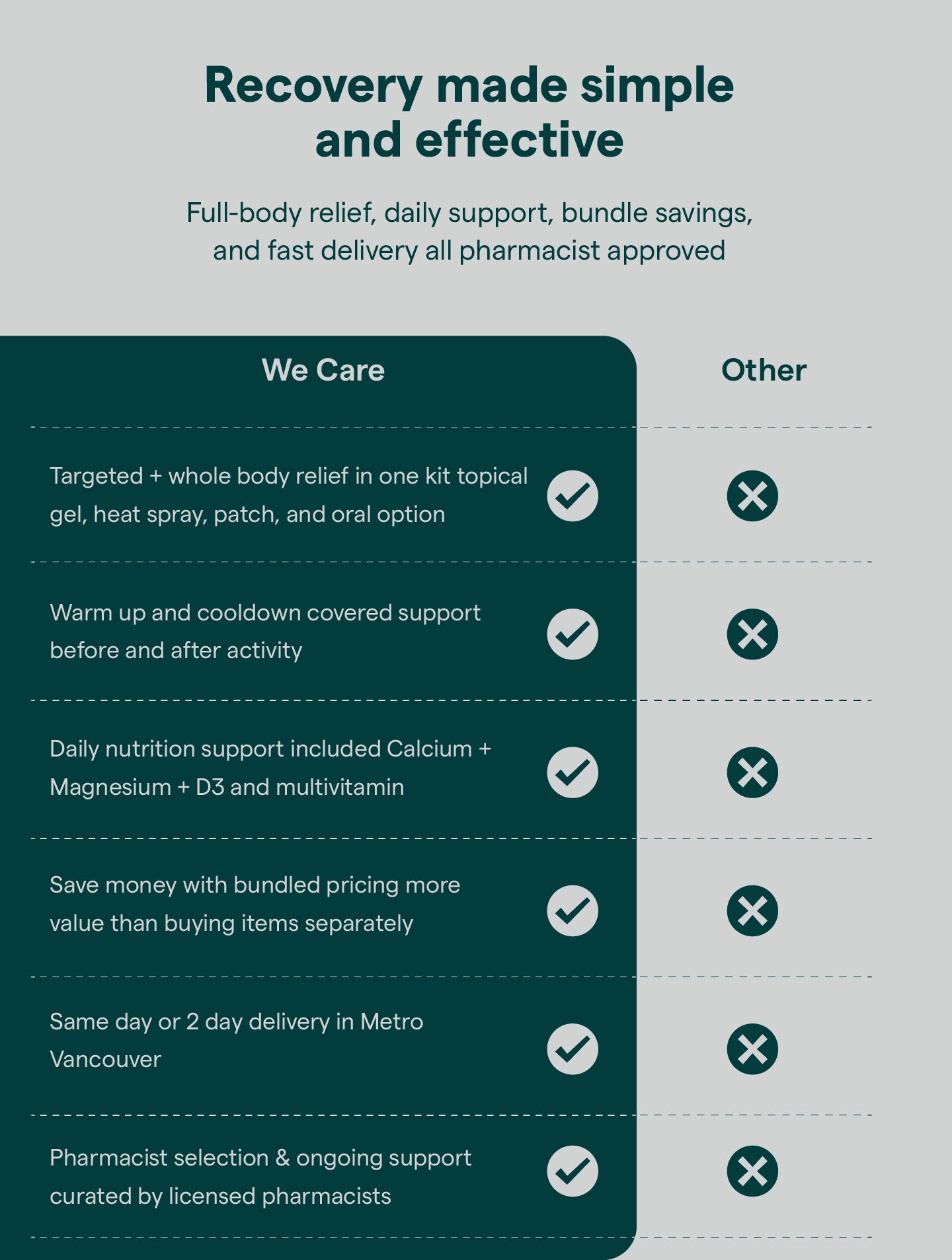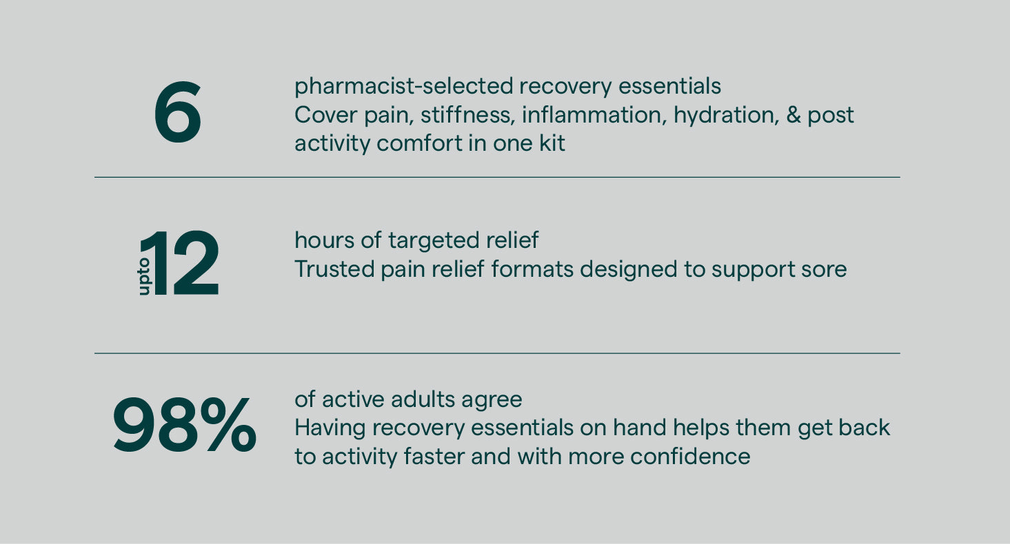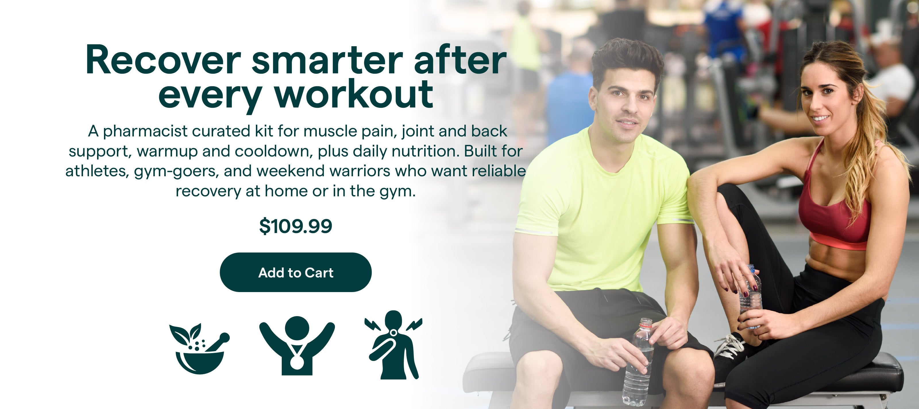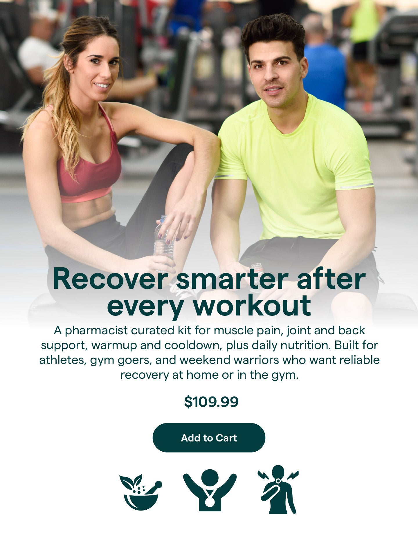 Recover faster and stay in peak form with our pharmacist-curated Sports Recovery & Muscle Support Kit. Designed for active lifestyles, this bundle features top-rated pain relief, muscle support, and daily vitamins, perfect for athletes, fitness lovers, and anyone on the move.