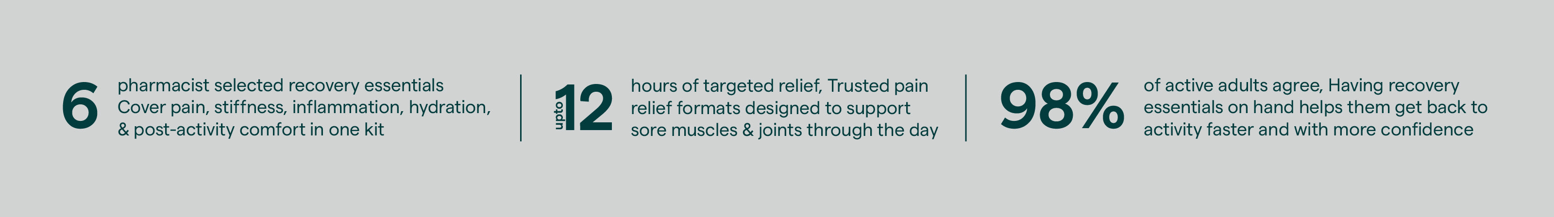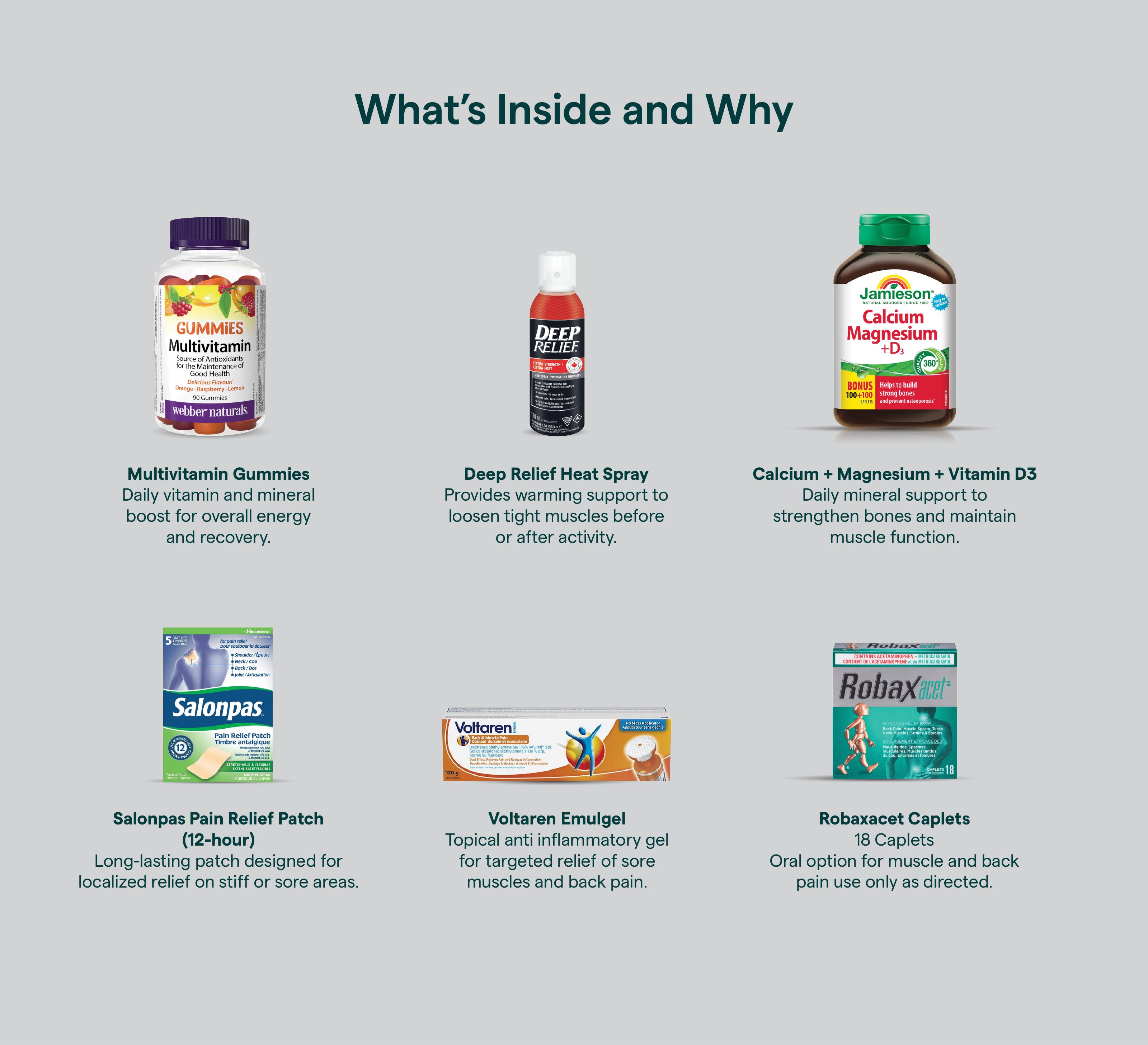 A recovery-focused kit designed to ease sore muscles, stiff joints, and post-workout aches. With patches, gels, sprays, and vitamins, it helps you move smarter and recover faster.