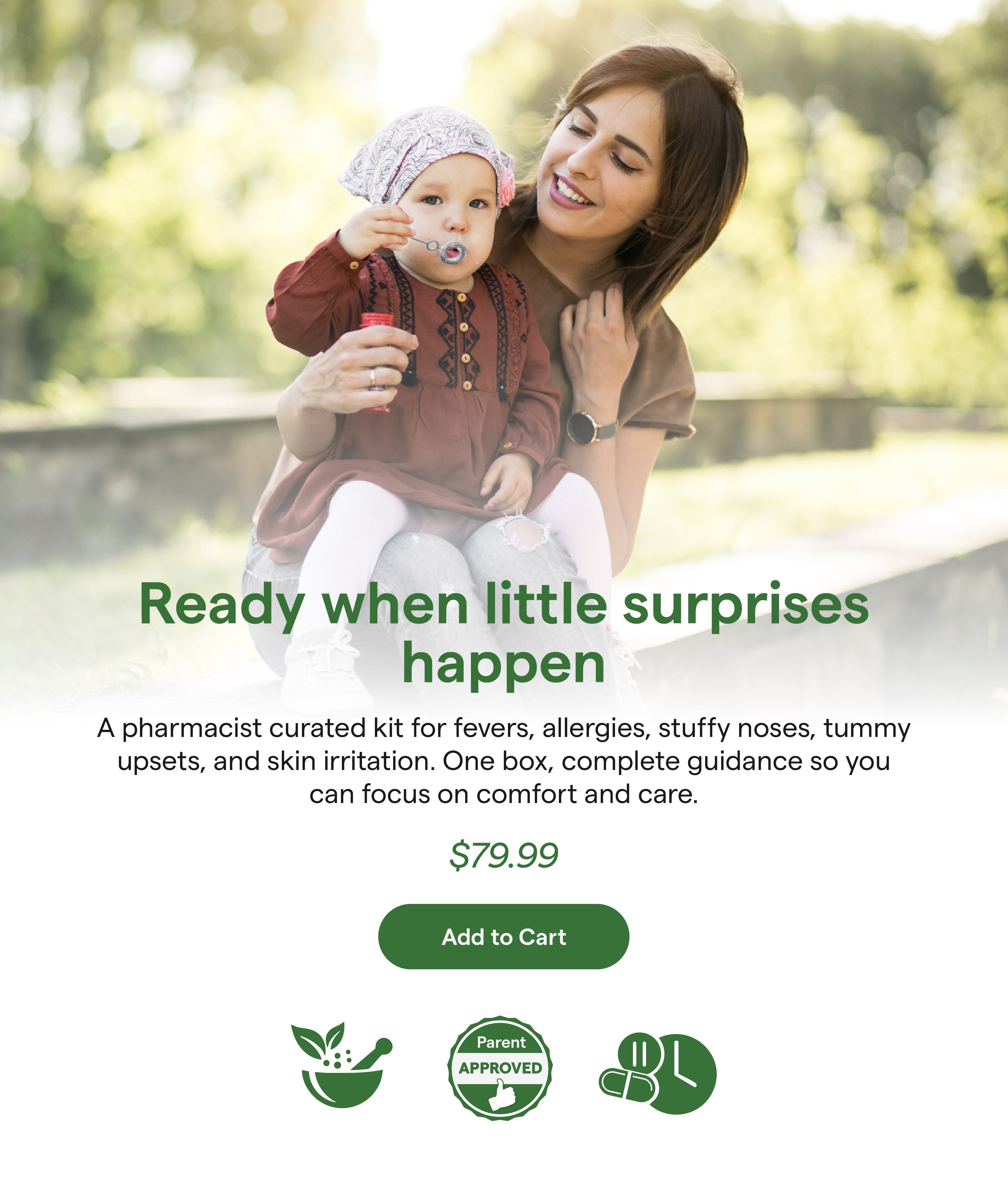 Keep your toddler healthy, happy, and ready for anything with our Toddler Health Medicine Kit. Curated by pharmacists and trusted by Canadian parents, this all-in-one bundle covers everyday fevers, allergies, stuffy noses, tummy upsets, and skin irritations, so you’re always prepared when little surprises happen.